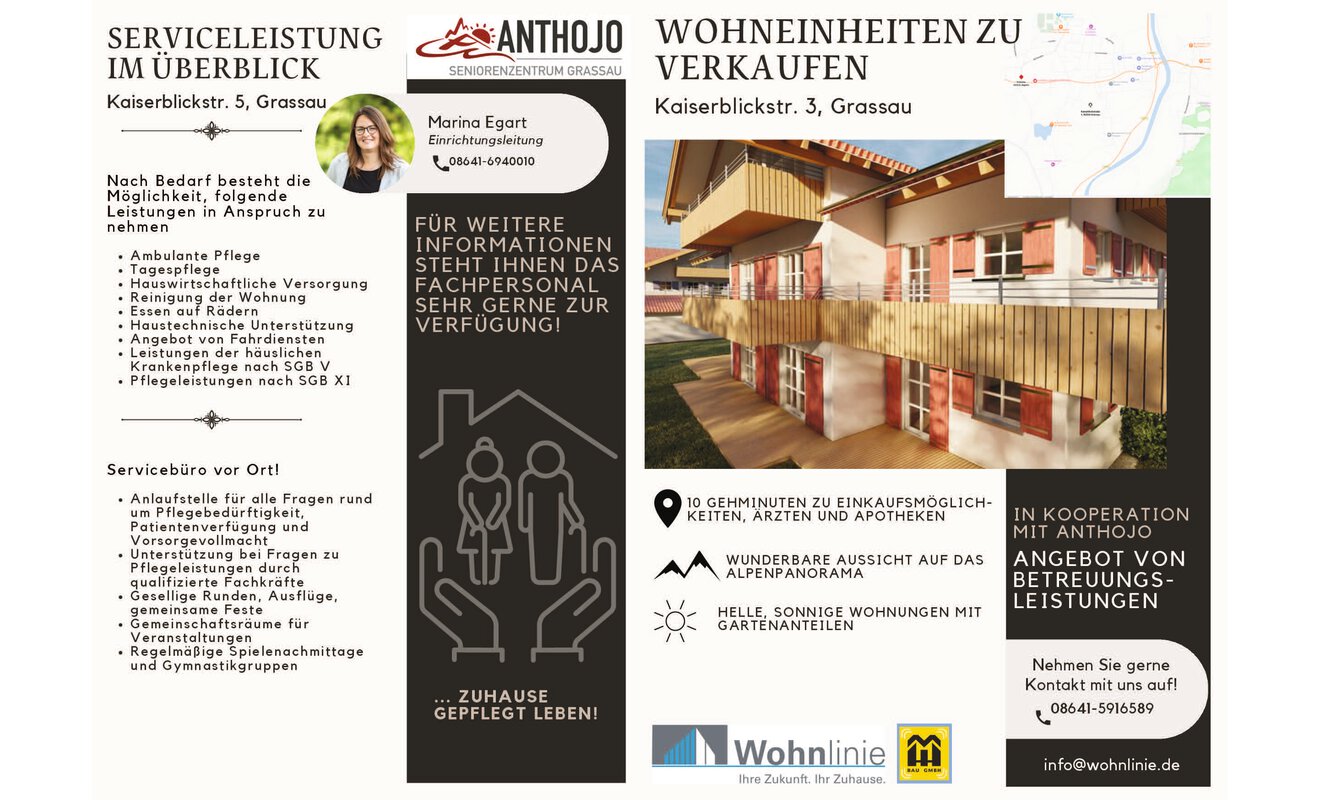 In hochwertiger Ausführung bieten wir Ihnen ein Zuhause in gemeinschaftlicher Atmosphäre auf einem Grundstück von 1029 m². Bei einer Wohnfläche von ca. 50 - 70 m² aufgeteilt auf 2-3 Zimmer dürfen Sie sich hier wohl fühlen. Wir bieten hier Wohneinheiten zur Miete sowie zum Verkauf an. In Kooperation mit dem daneben gelegenen Pflegeheim Anthojo bieten wir zusätzliche Serviceleistungen an.
