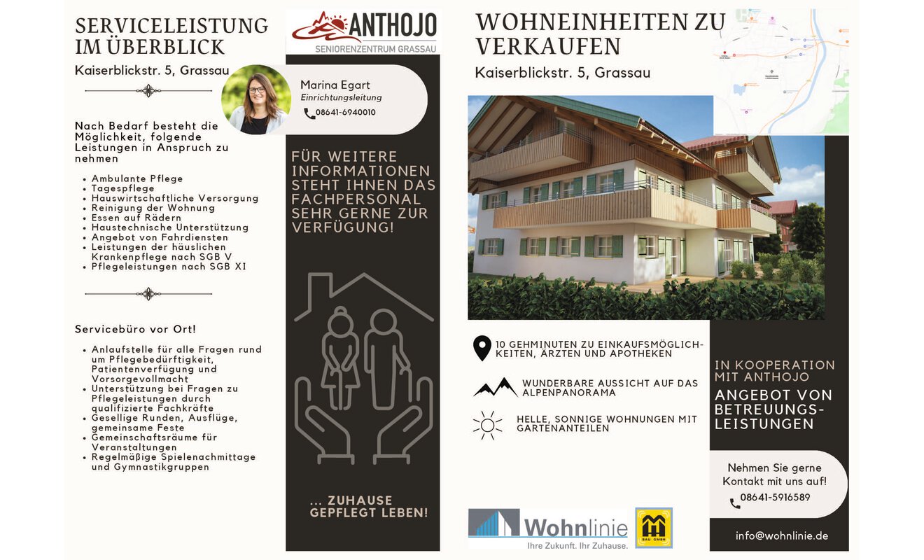 In hochwertiger Ausführung bieten wir Ihnen ein Zuhause in gemeinschaftlicher Atmosphäre auf einem Grundstück von 1029 m². In diesem Neubau befinden sich insgesamt 8 Wohneinheiten mit einer Auswahl von 2-3 Zimmerwohnungen mit ca. 50 - 70 m². Um das Wohlfühlpotenzial auch im Alter aufrecht zu erhalten, bieten wir gemeinsam mit dem unmittelbar daneben gelegenen Seniorenheim Anthojo zusätzliche Serviceleistungen an, die je nach Bedarf in Anspruch genommen werden dürfen.